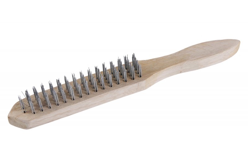 Oceľová kefa - ručná, oceľový drôt - pozinkovaný, drevené telo, dĺžka 300 mm, ergonomicky upravená rukoväť, 4 rady, počet drôtov: 960, použitie: na čistenie železných kovov ako je oceľ, nerez, liatina, zdrsnenie, a hrubé odstránenie, a hrubé odstránenie starých