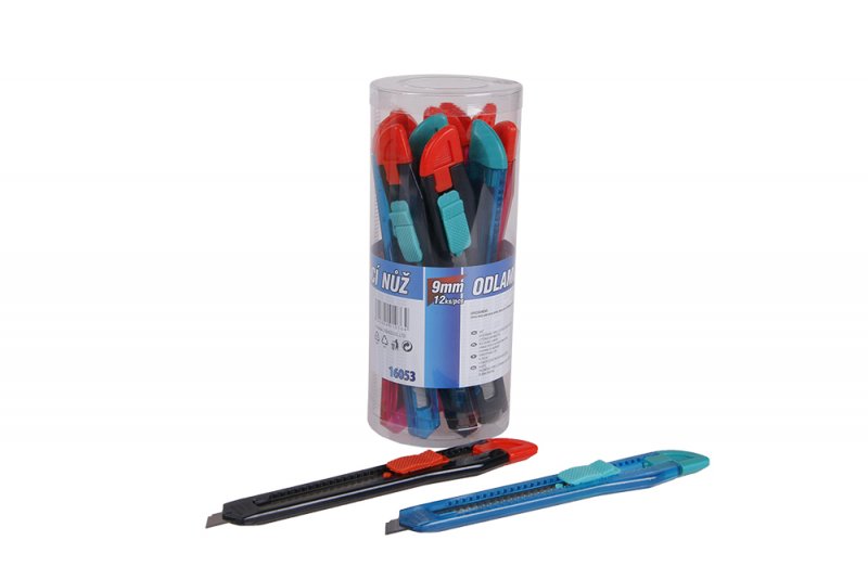 Sada plastových odlamovacích nožov 9mm, 12ks, plastová kruhová dóza, farebný mix.