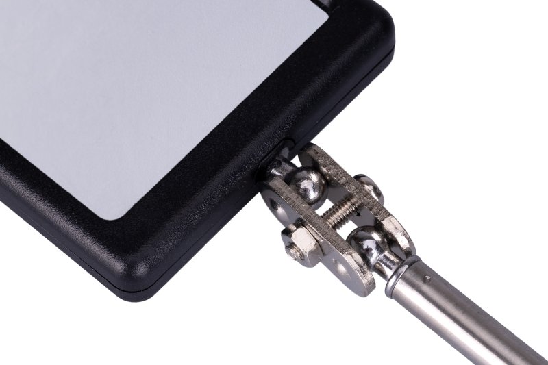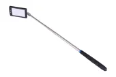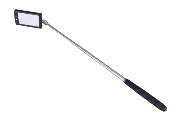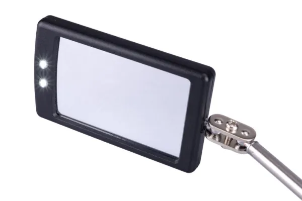 zrkadlo na teleskopickej násade s dvoma LEDkami rozsah dĺžky násady 290 - 876 mm, rozmer zrkadla 50 x 30 mm teleskopická časť z nerezovej ocele, ergonomická pogumovaná rukoväť napájanie LED osvetlenie 2 x batéria CR 2032 (súčasťou balenia)